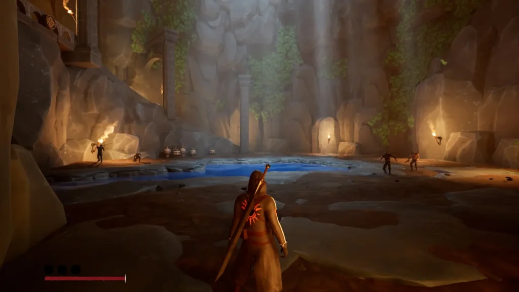 Action-adventure com gancho de arrasto para explorar, resolver puzzles e combater fluidamente na busca pela espada mítica Exoria.