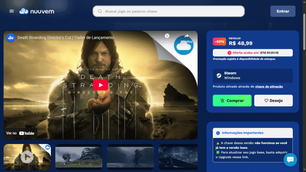 Prepare-se para reconectar uma sociedade fragmentada. O visionário Death Stranding Director’s Cut está com um desconto imperdível na Nuuvem, saindo por apenas R$ 48,99 (69% OFF) com ativação na Steam.